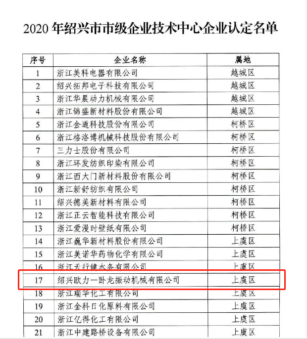 歐力-臥龍振動機械企業技術中心已于2013年10月12日被認定為省級高新技術企業研究開發中心,此次入選紹興市市級企業技術中心,是對企業技術能力的再一次認可。未來,歐力-臥龍將進一步遵循加強企業技術中心建設的指導,完善企業技術創新體系,不斷提升企業的技術創新能力,力爭引領推動產業創新發展。